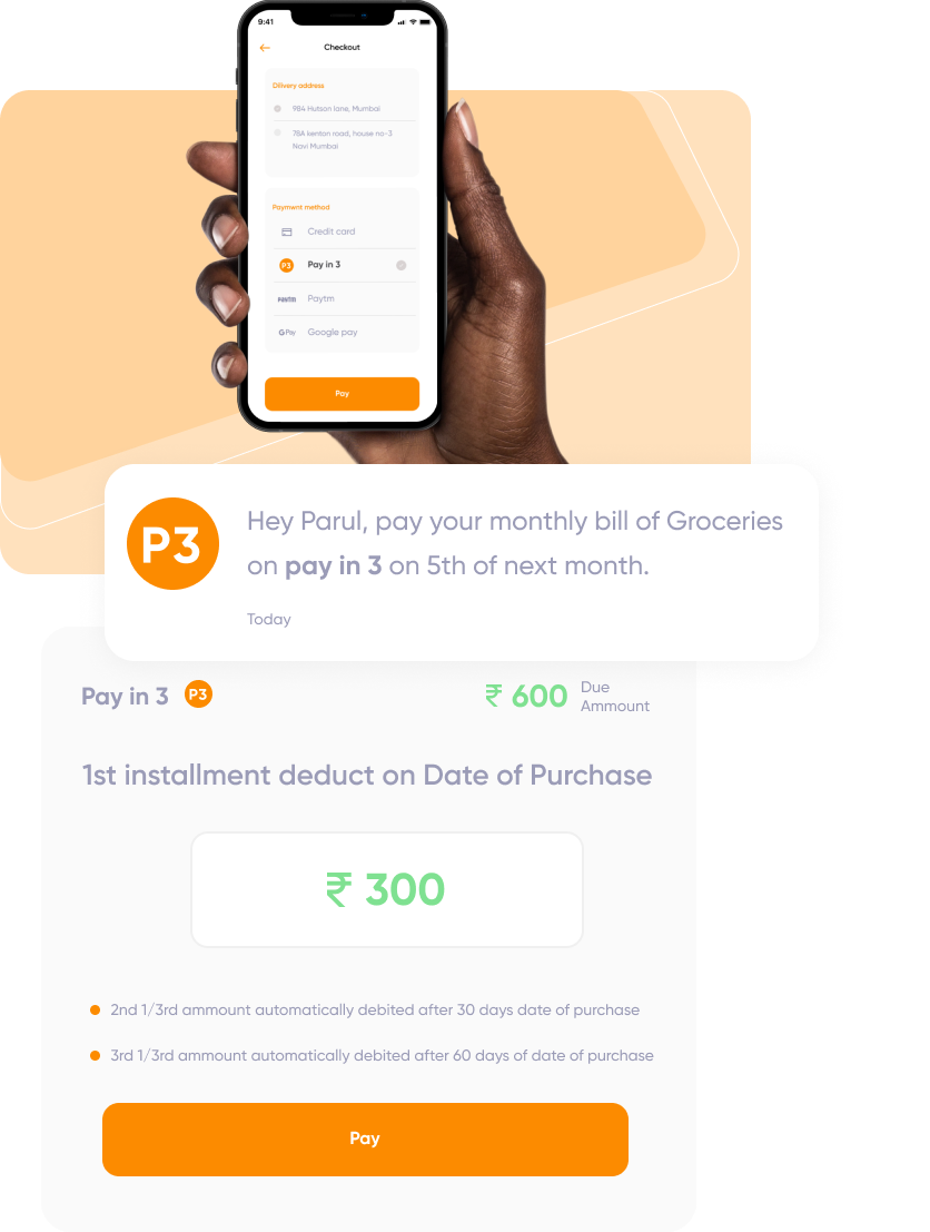 Let your users pay only 1/3rd and complete the purchase while the remaining get’s debited 30 & 60 days later in 2 parts via UPI @ Zero Interest!
